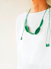 今回ご紹介するのは、私の住むバリ島の自然の産物や散歩の途中で見つけた木の実などからインスパイアされた硬い樹の実のような立体的なパーツがアクセントのレザーロングネックレス。