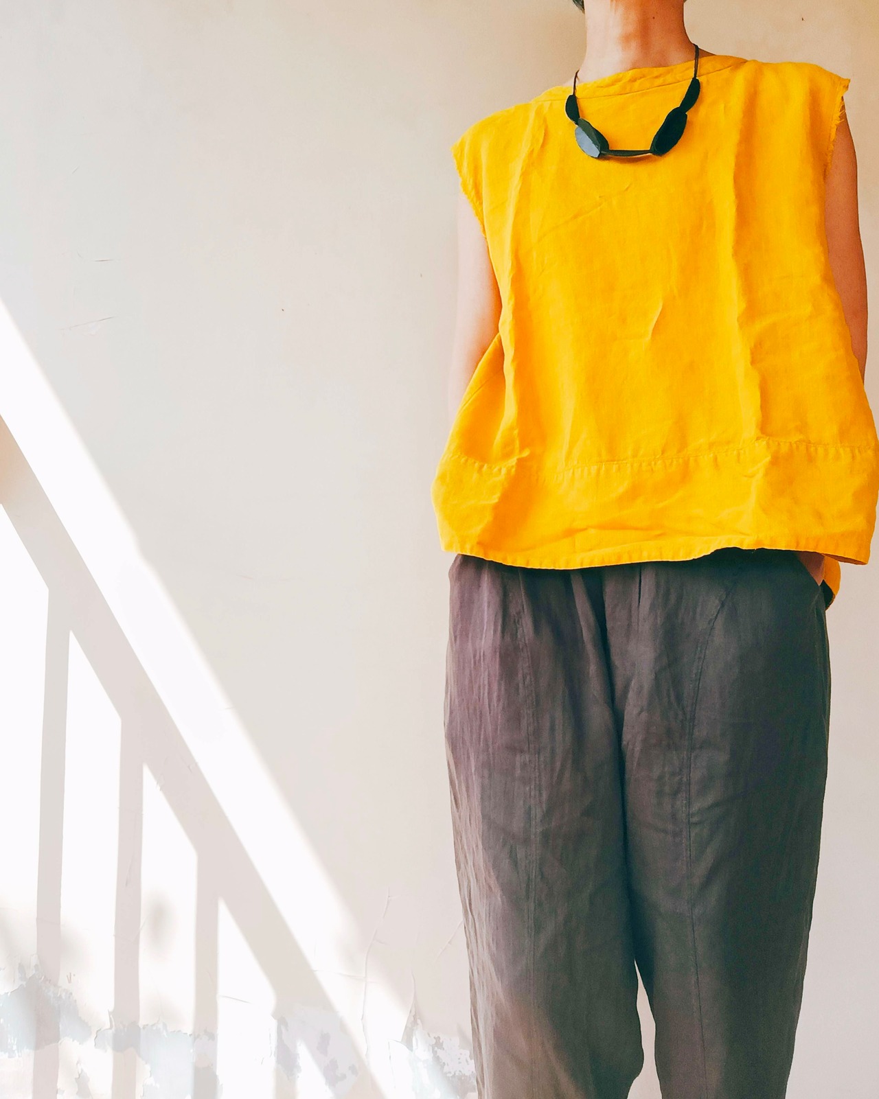 レザーネックレスと聞くと、ハードなイメージがありますが、バッグを作る際に使用する、若干ワックスのかかったコットン紐を使うことで、大きめのパーツとのバランスもよく、抜け感のあるネックレスに仕上がってます。