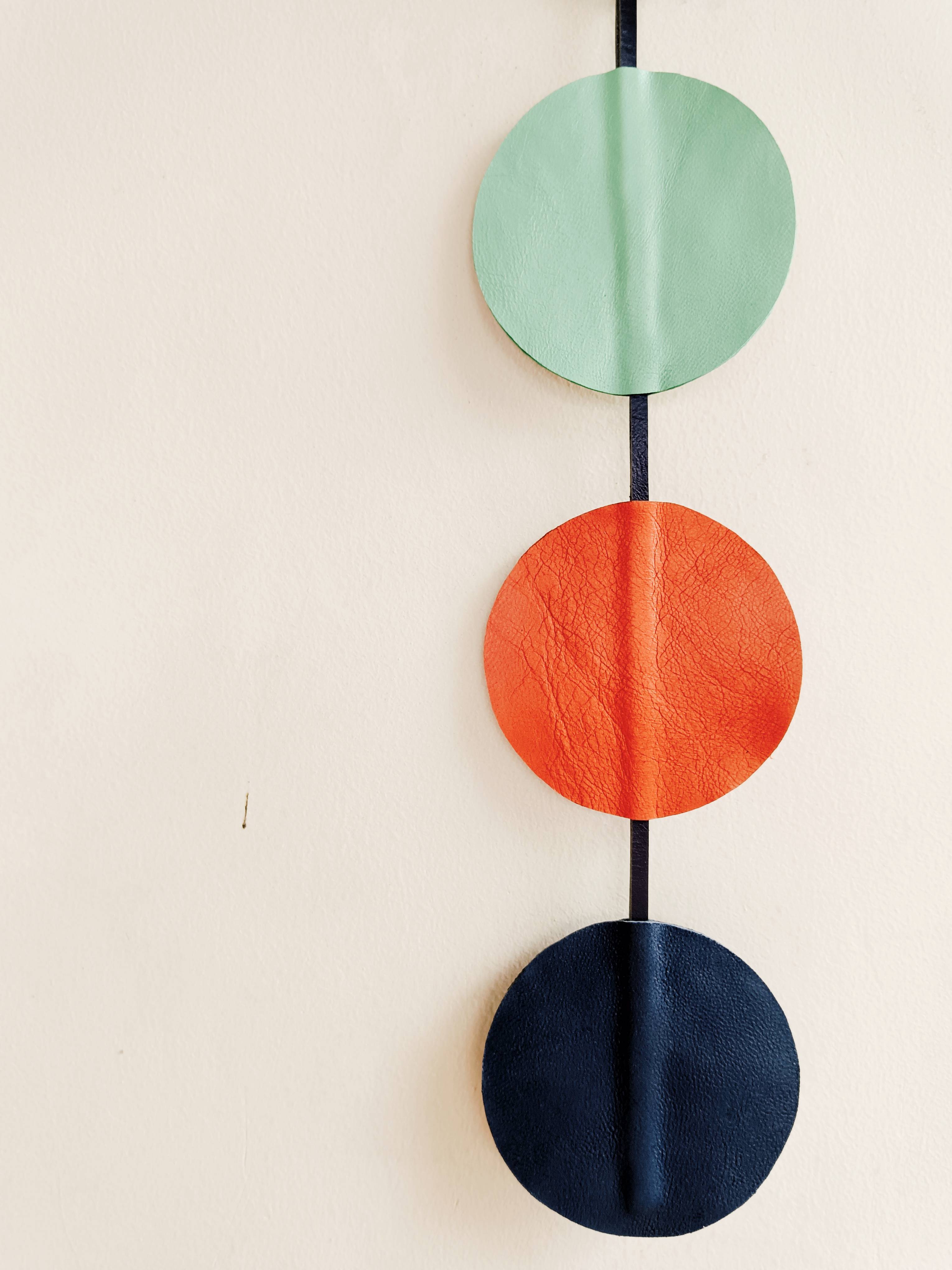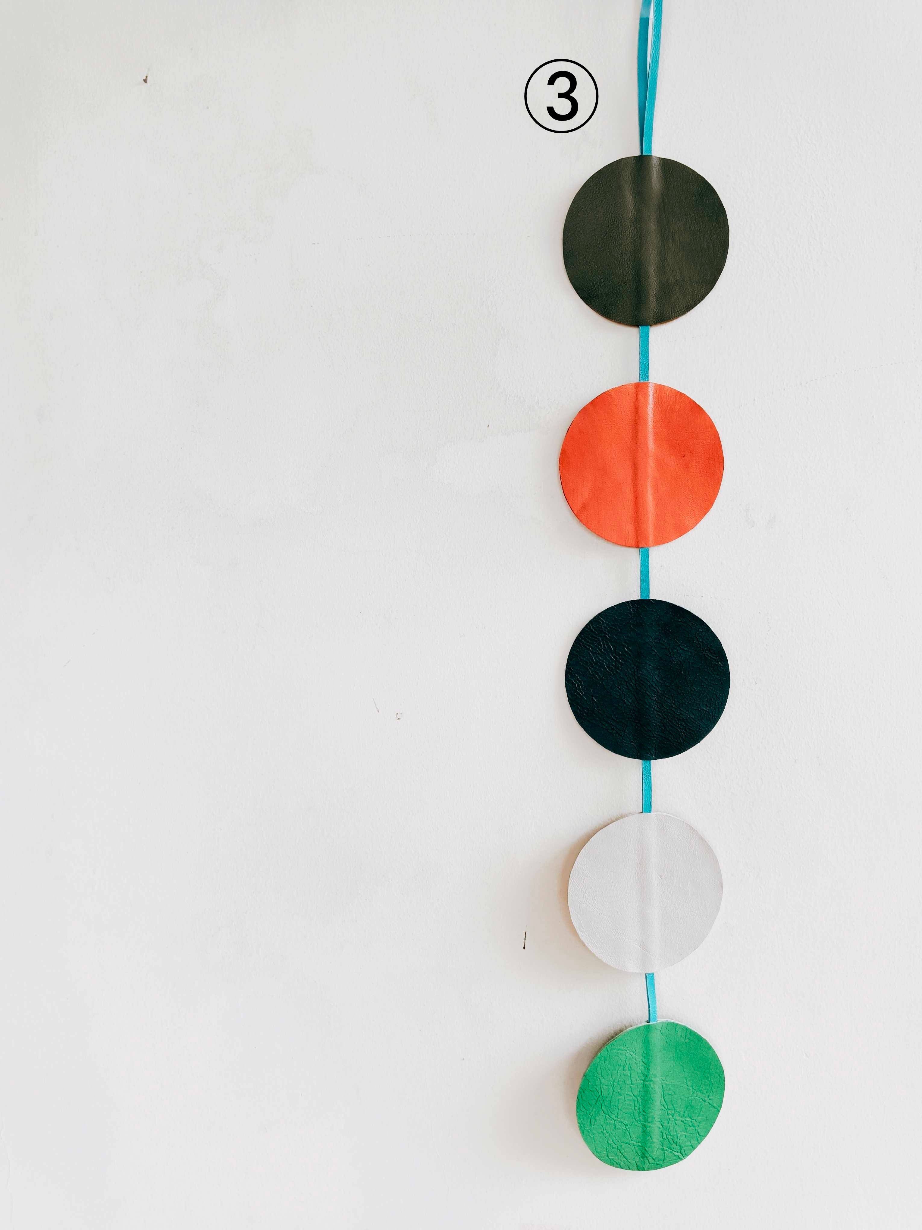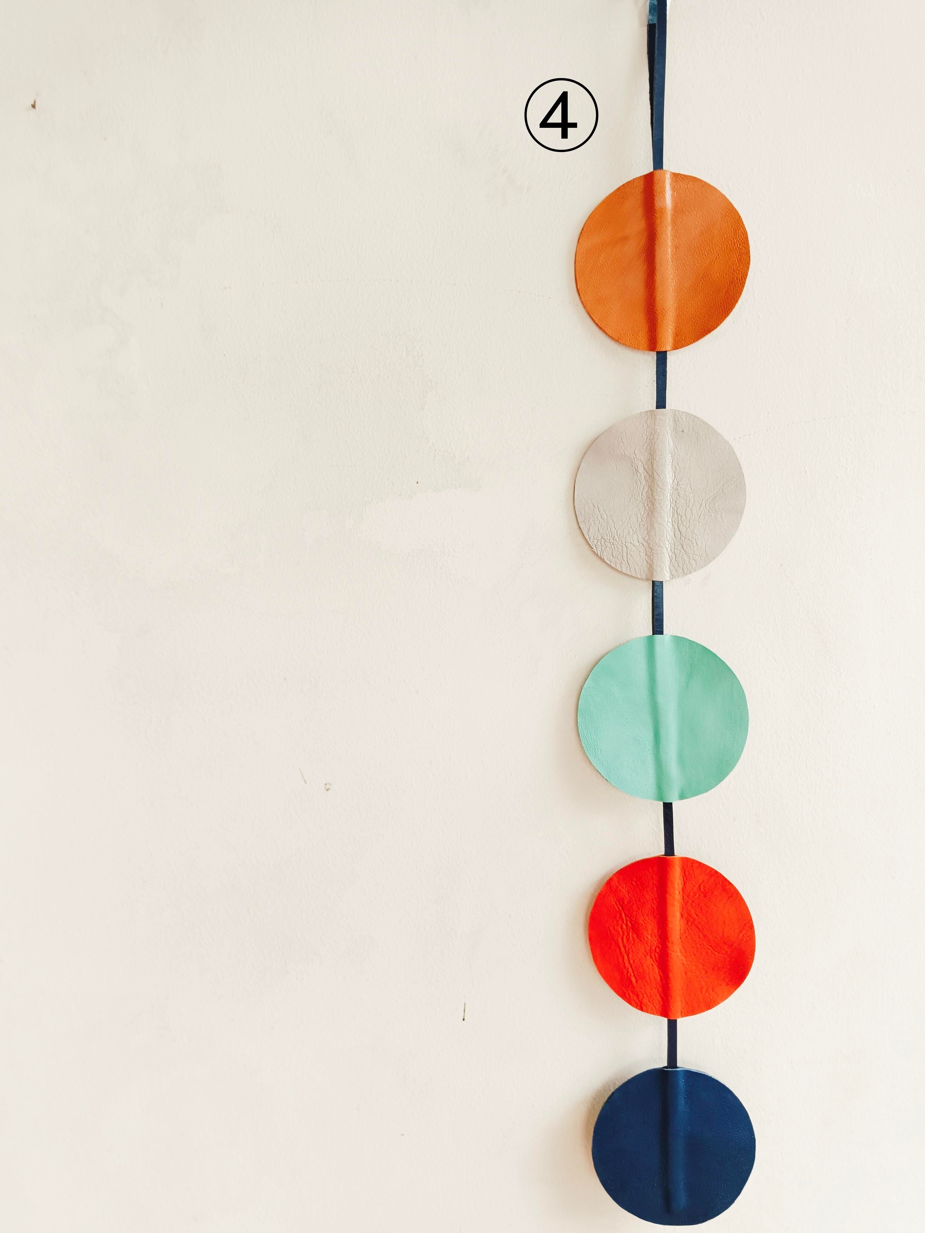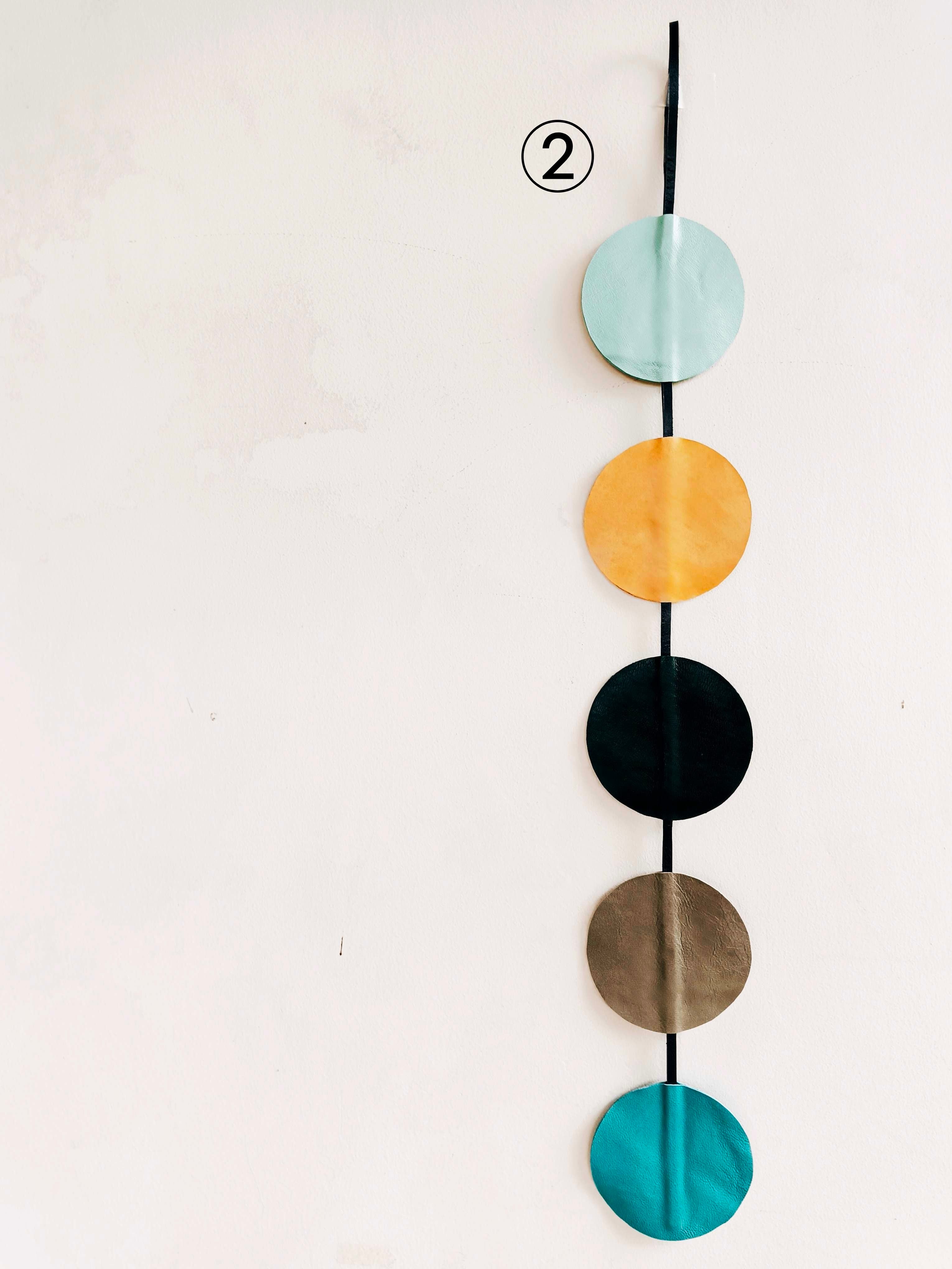 革の端材を大胆に使って、色んな色を組み合わせた、dotが可愛らしいウォールデコ。