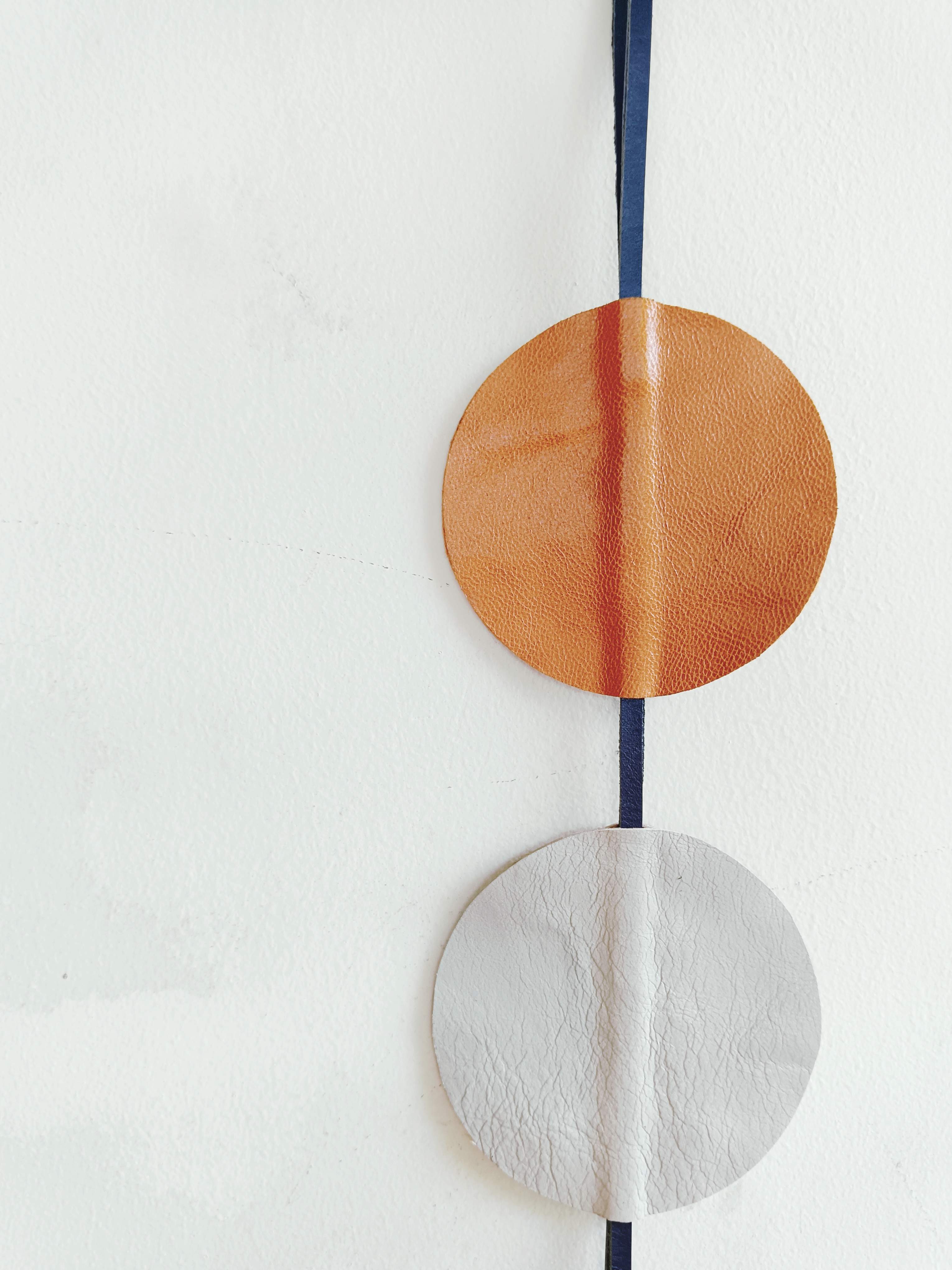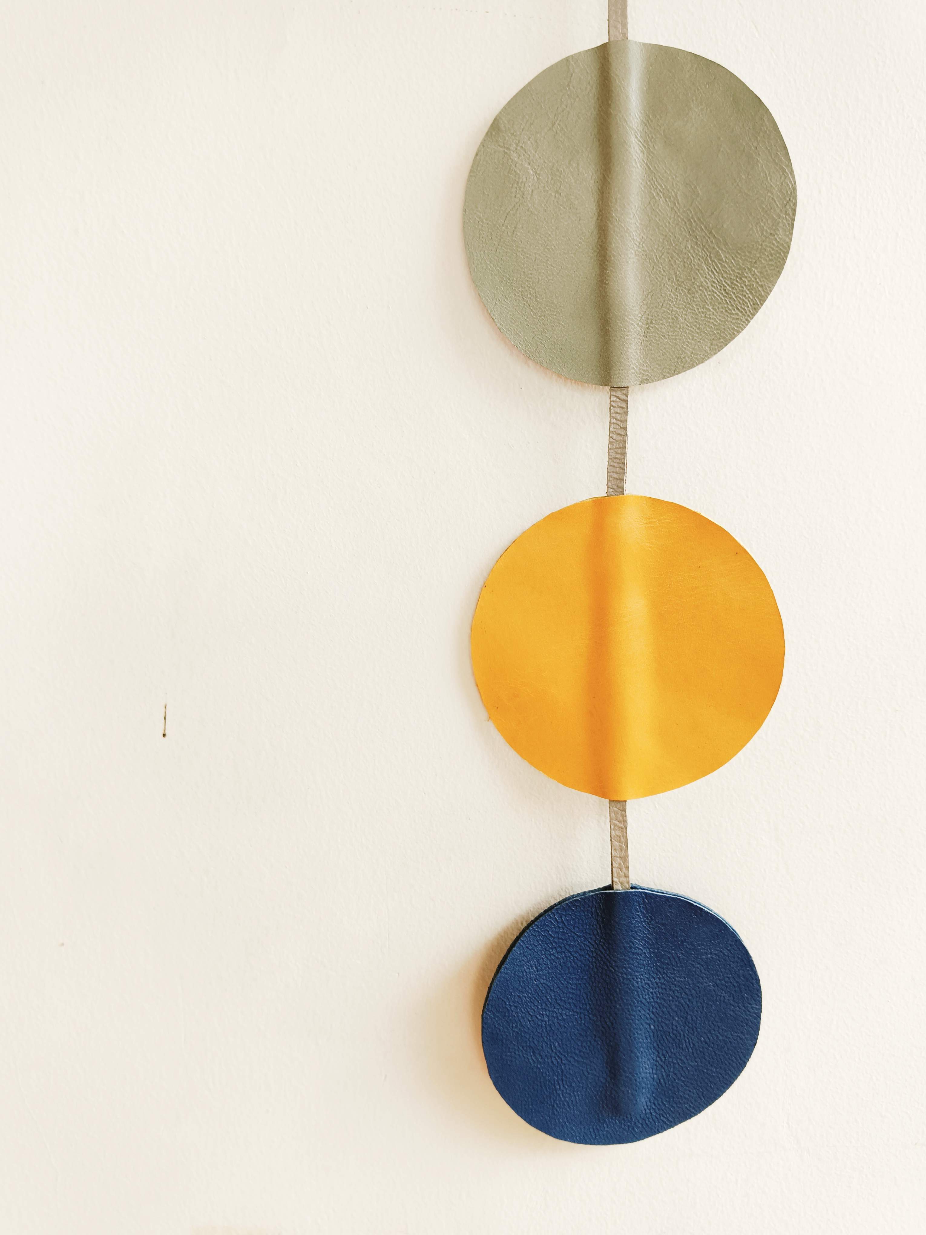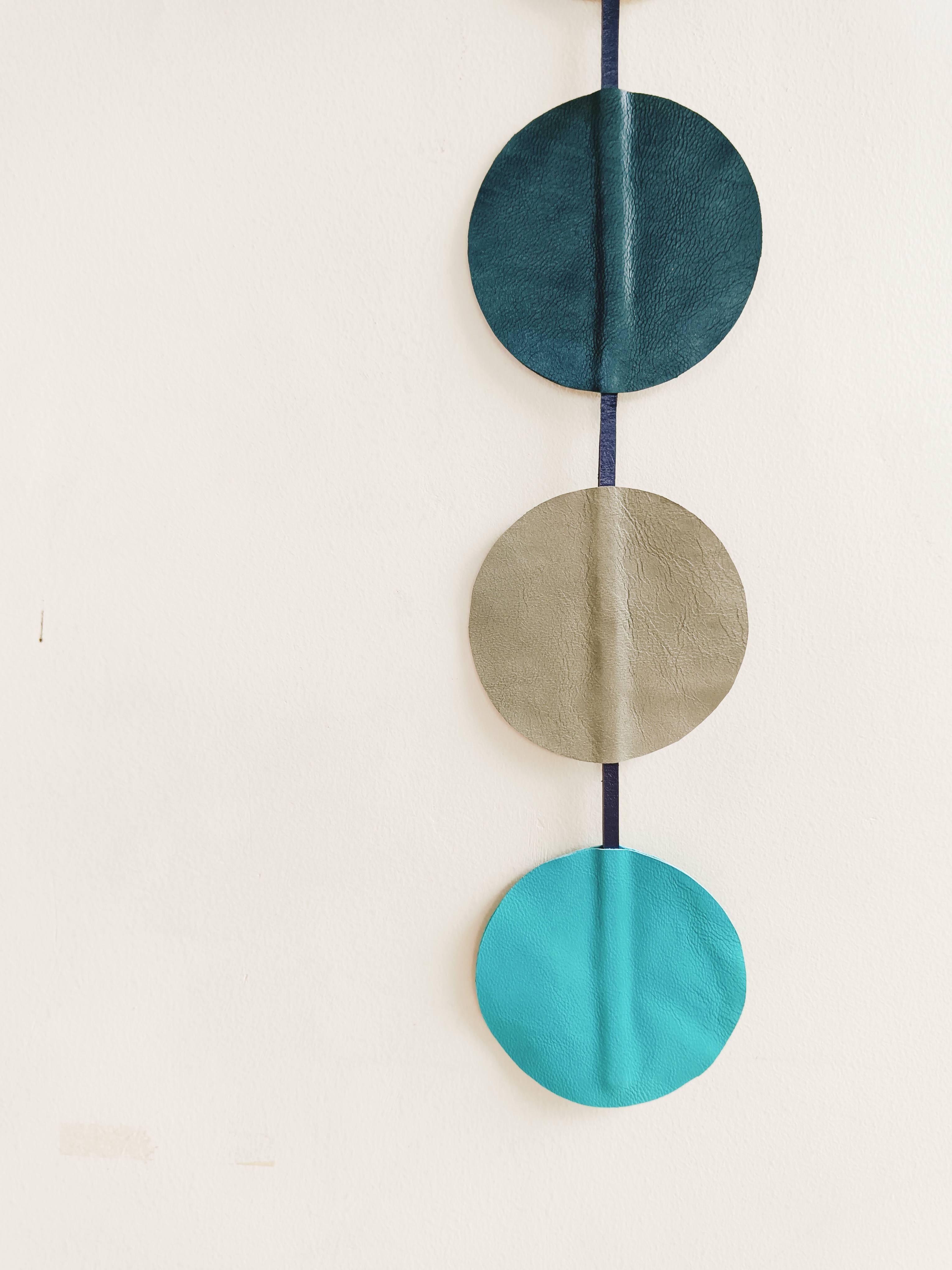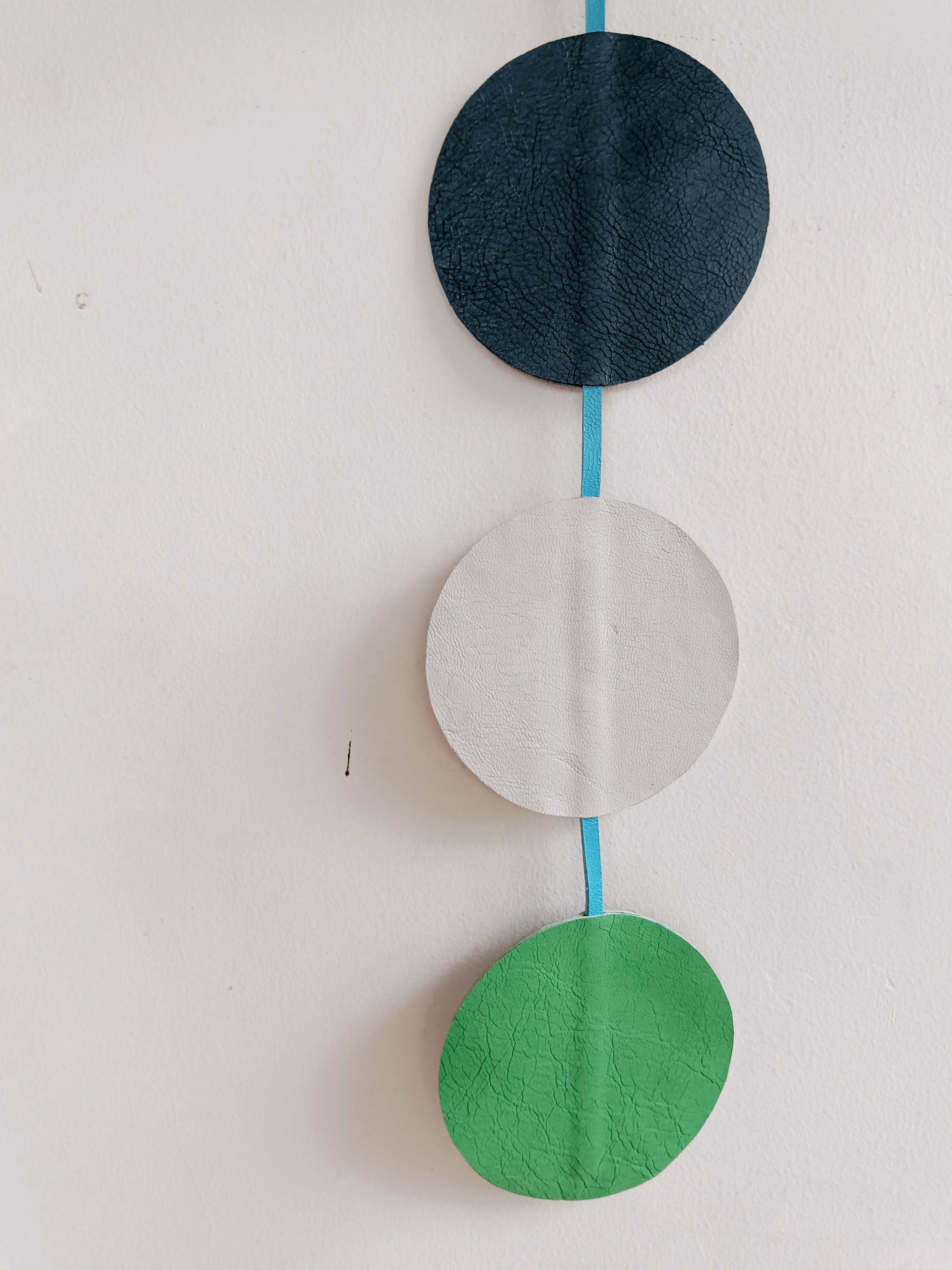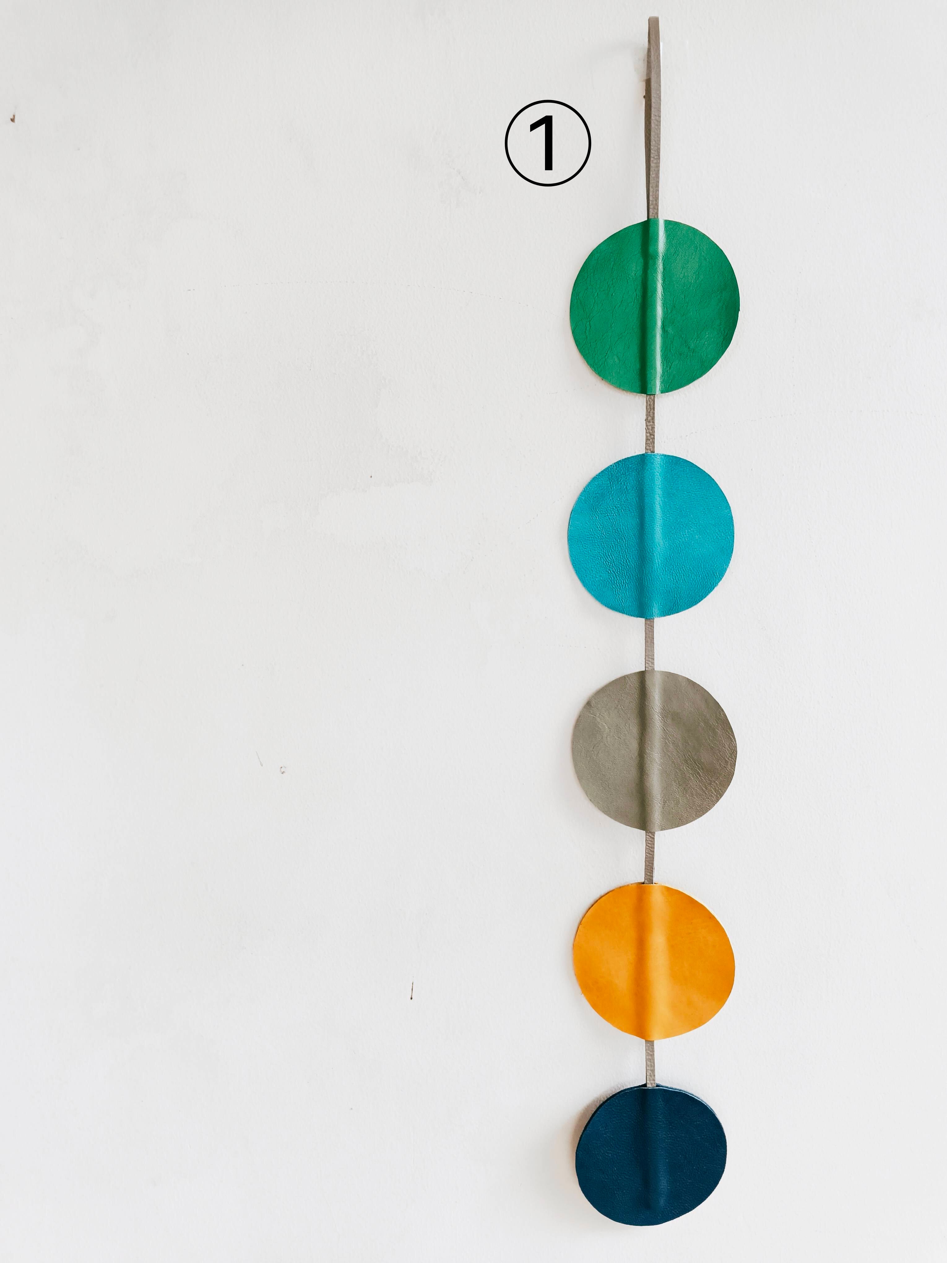 革の端材を大胆に使って、色んな色を組み合わせた、dotが可愛らしいウォールデコ。