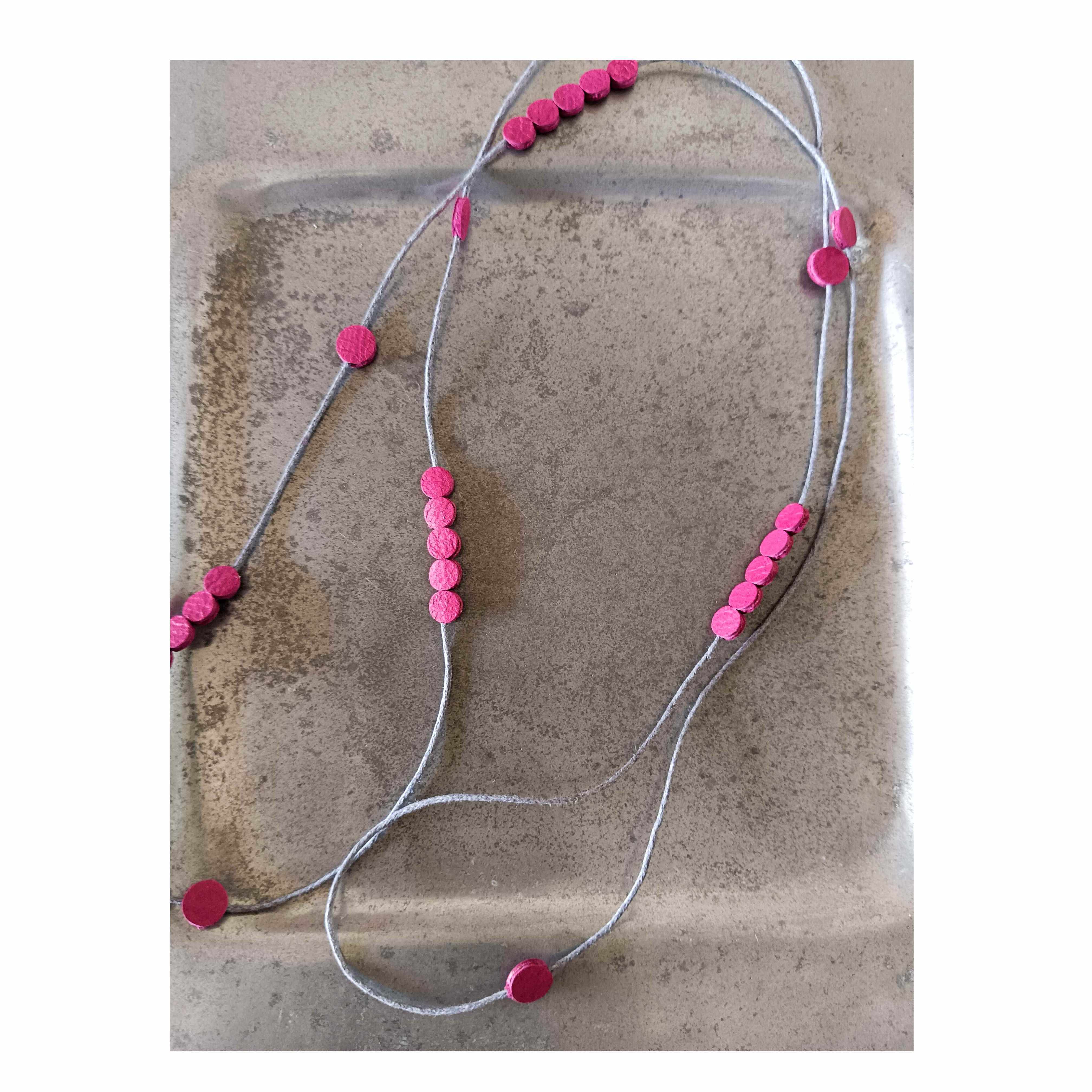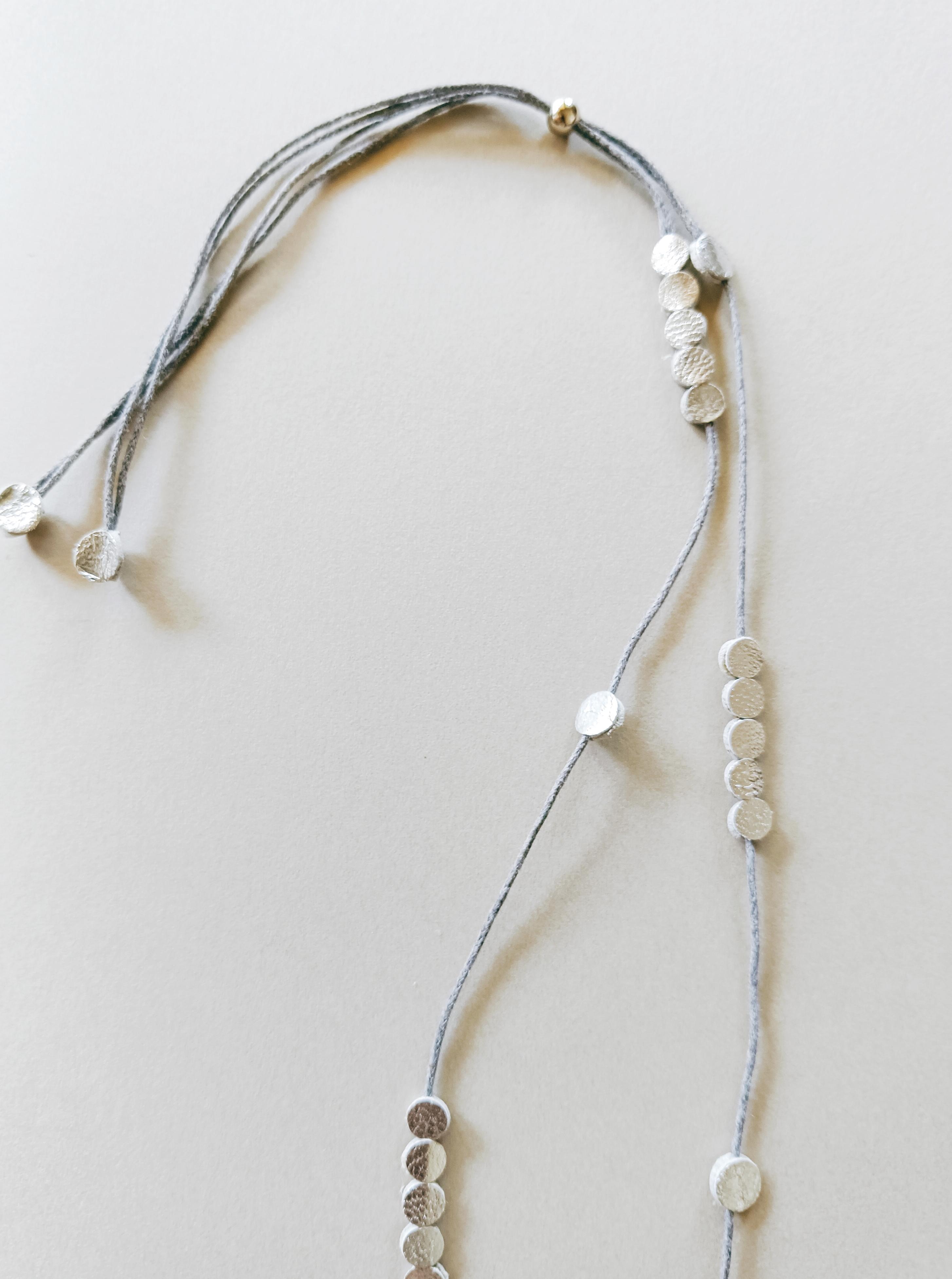 大振りなものではなく、気軽に使えるけれど、華奢なネックレス、、レザーを使うと中々これが難しかったのですが、最近登場した『dot-straight lineピアス』からヒントを得て、バッグの縫い紐もとして使っている、コットンに若干コーティングされたもの(強度は抜群!)を使い、●●を間隔をあけて配置することで、華奢ながらも、しっかり存在感のあるロングネックレスが出来ました♡